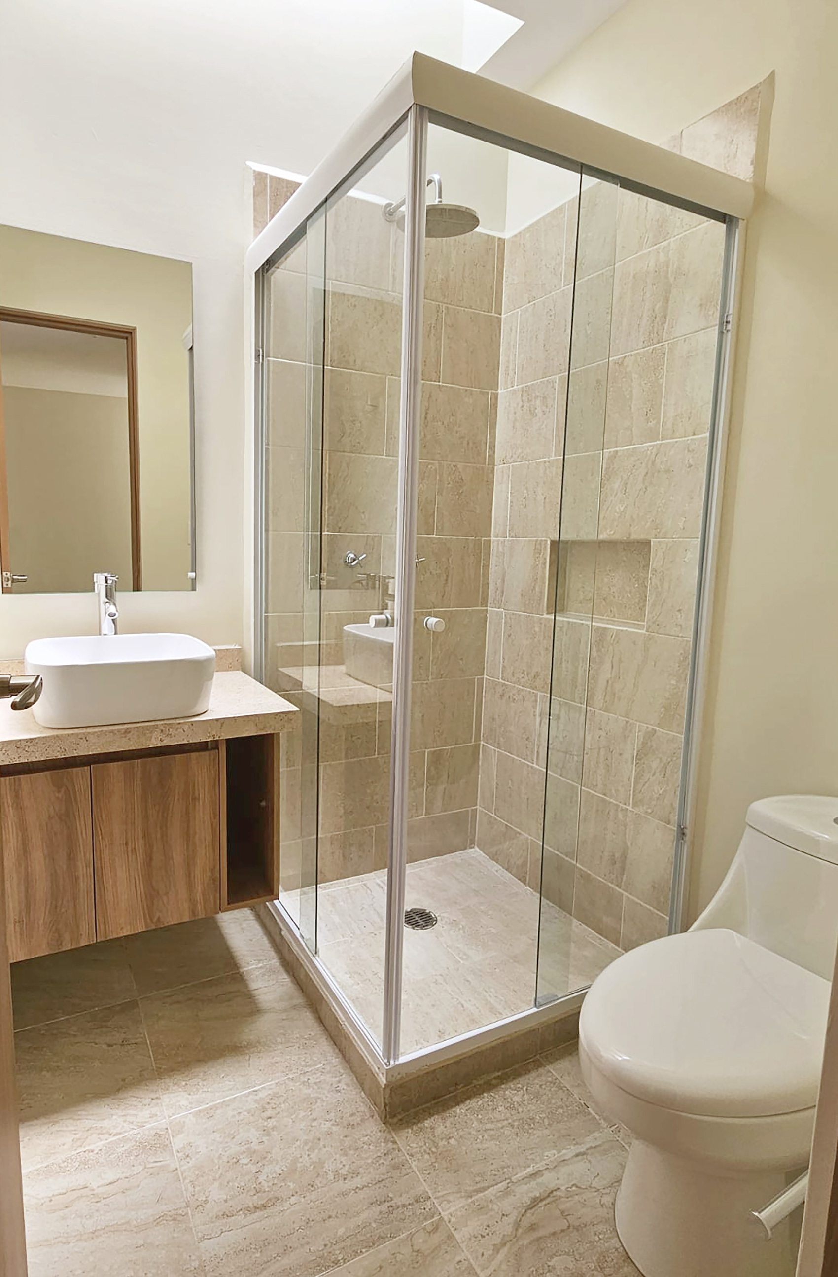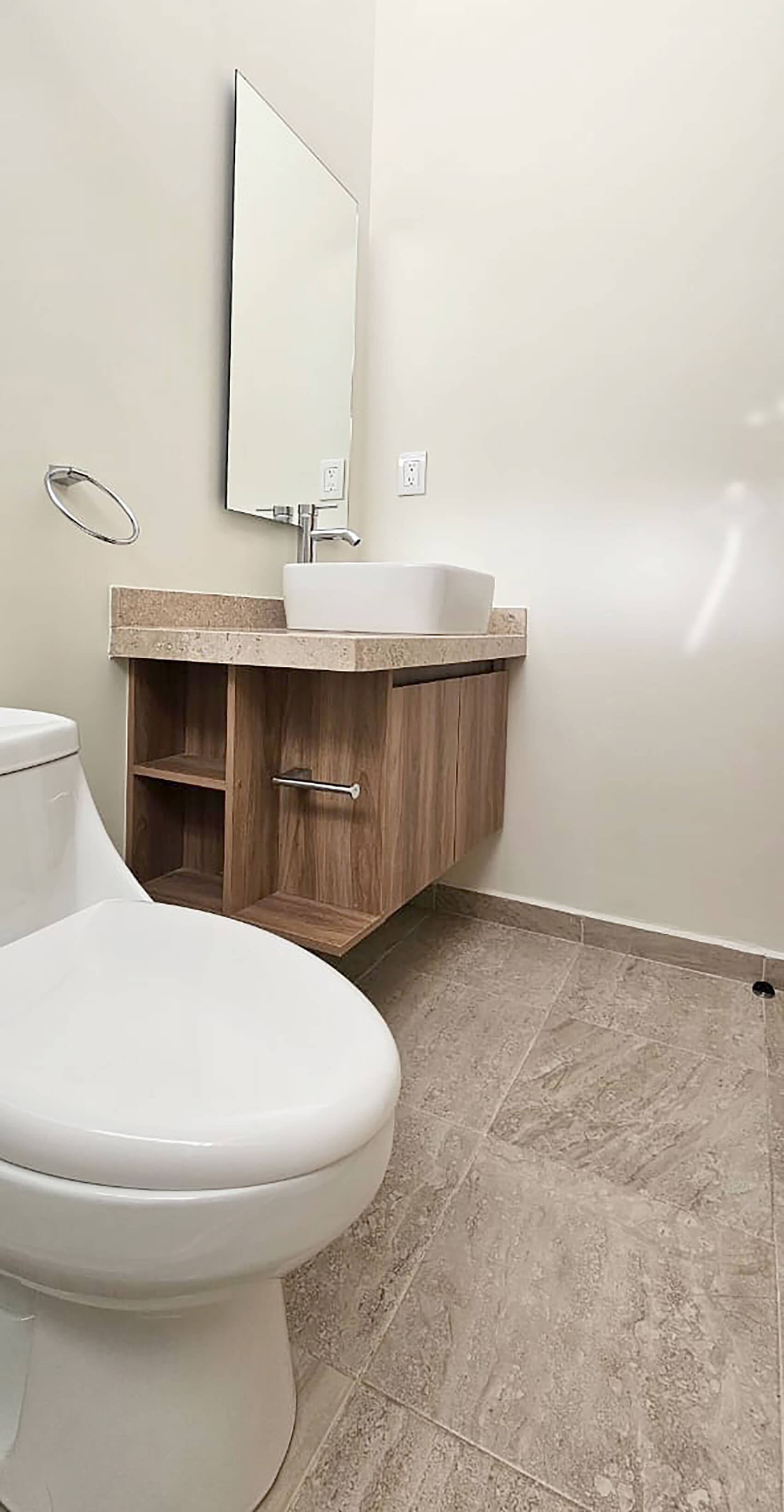 Planta alta: 3 recámaras con closets, la principal con baño, baño compartido para recámaras secundarias.